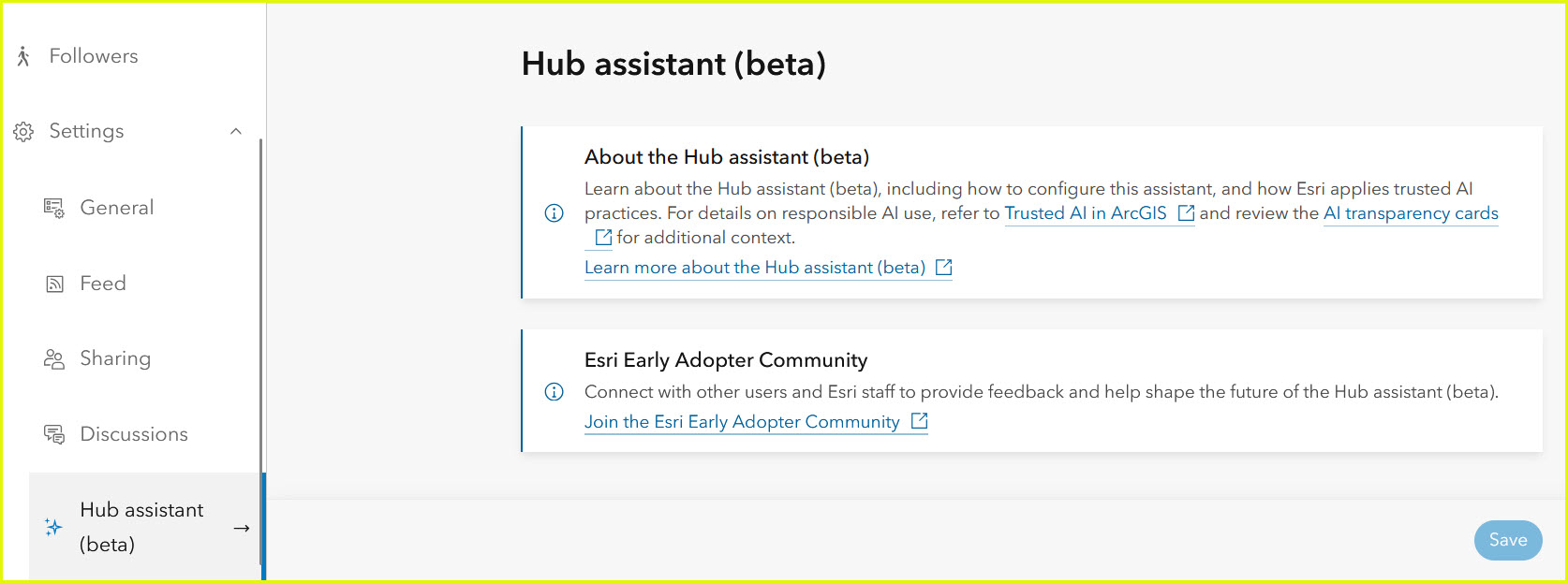 The Hub assistant (beta) is available with workspaces, the new experience in Hub. Workspaces provide a more consistent editing experience for items across Hub. Learn more in the ArcGIS Blog article: Workspaces is the new site management experience in ArcGIS Hub.