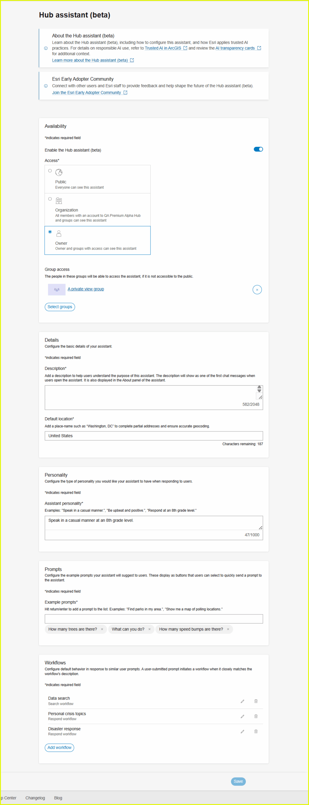 As with any feature on your Hub site, it’s important to test the Hub assistant (beta) within your organization before deploying it on your public-facing site. Create a testing group of organization members and restrict access to only that group. As described above, you can control access in the site workspace on the Settings > Hub assistant (beta) pane under Availability.