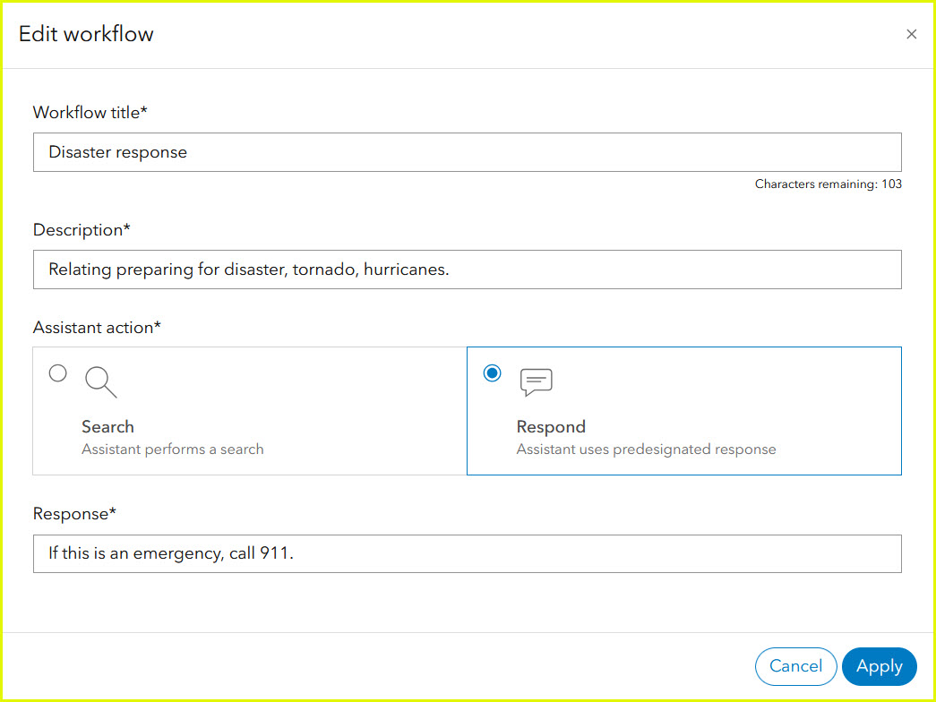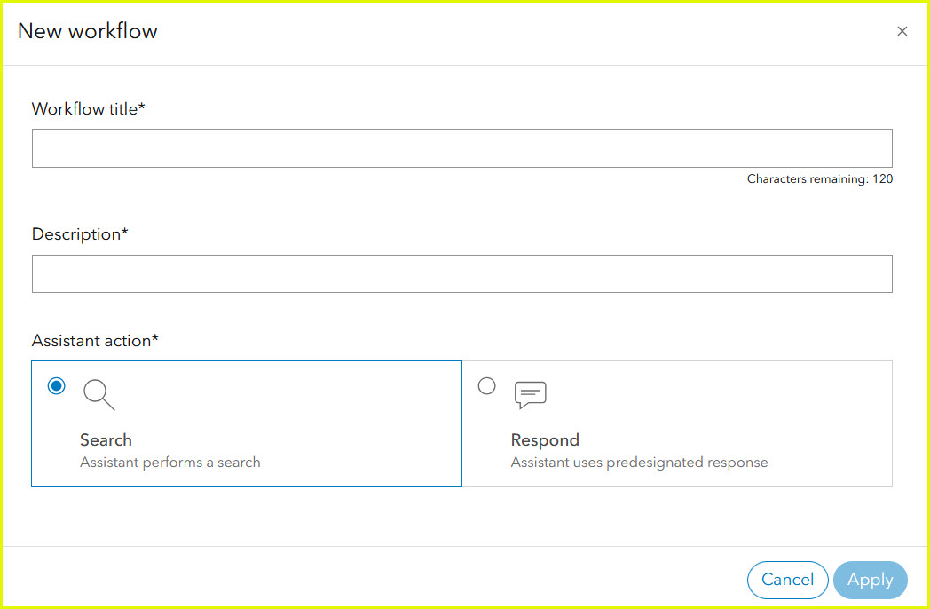 To add additional workflows, select the Add workflow button. Enter a title and description and choose a search or respond action.