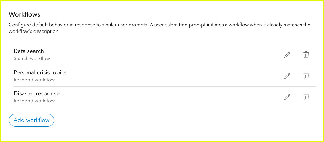Hub provides three default workflows as a place for you to start. This includes a search workflow: Data search and two response workflows: Personal crisis topics and Disaster response. The Hub assistant (beta) initiates a workflow when the workflow’s description closely matches a user-submitted prompt.