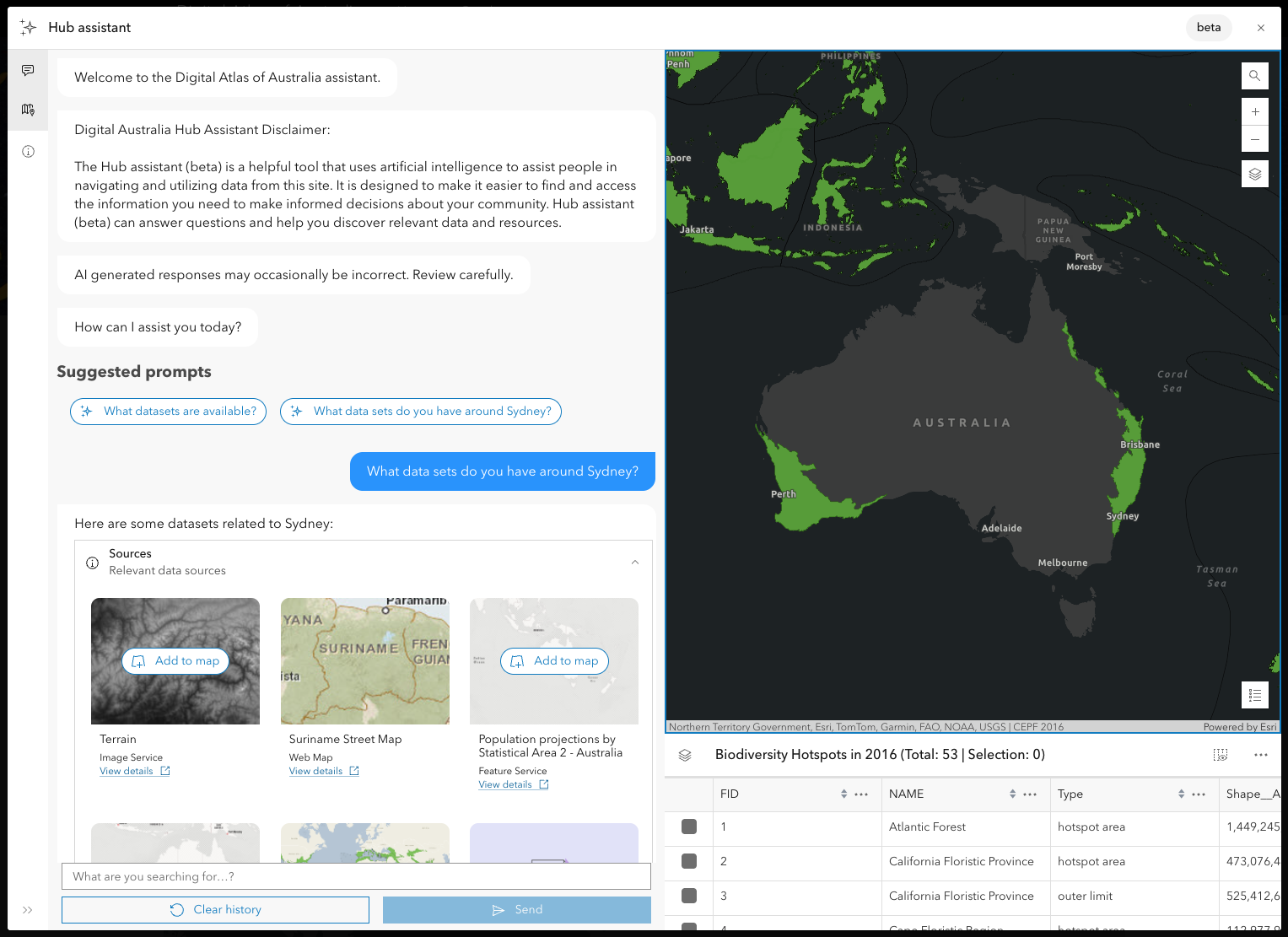 Consider carefully that artificial intelligence can generate suggestions that are misleading or inaccurate. Apply human judgment in interpreting and acting upon the assistant’s outputs to avoid the possibility of reinforcing any unintentional biases in the AI models used by Hub assistant (beta). Report any security or privacy concerns to the ArcGIS Trust Center.