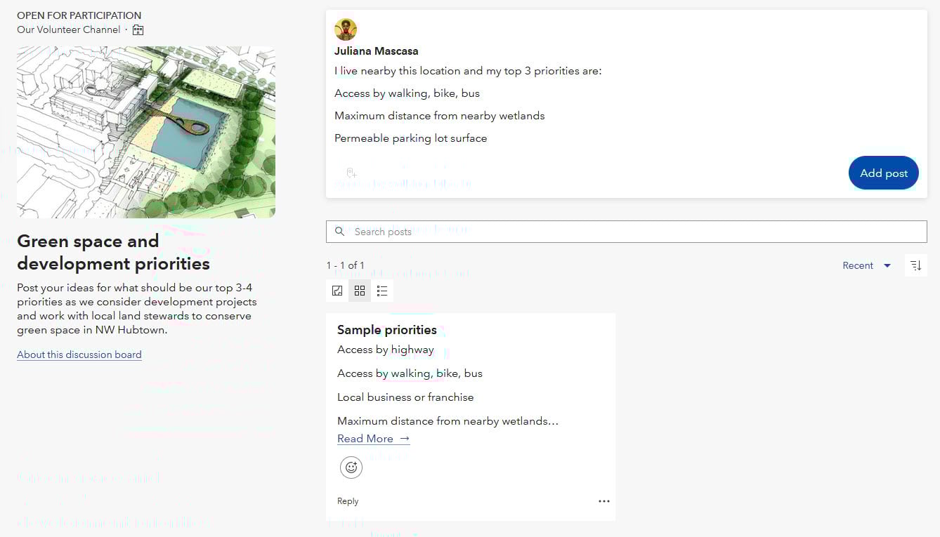 ArcGIS Hub’s introduction of discussion boards can empower you and your community to shape your environment through creative collaboration. This Premium feature builds on Hub’s existing engagement tools to enhance community engagement, foster two-way communication, and be a catalyst for change.