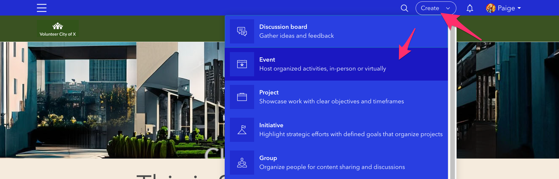 - Global navigation header by selecting Create and selecting Event from the dropdown menu.