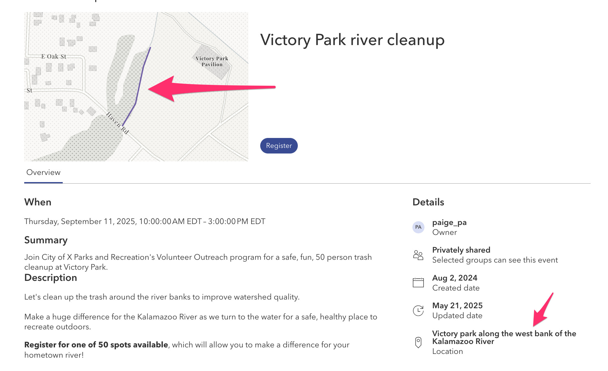 - Set the event’s location to display a map on the event view.