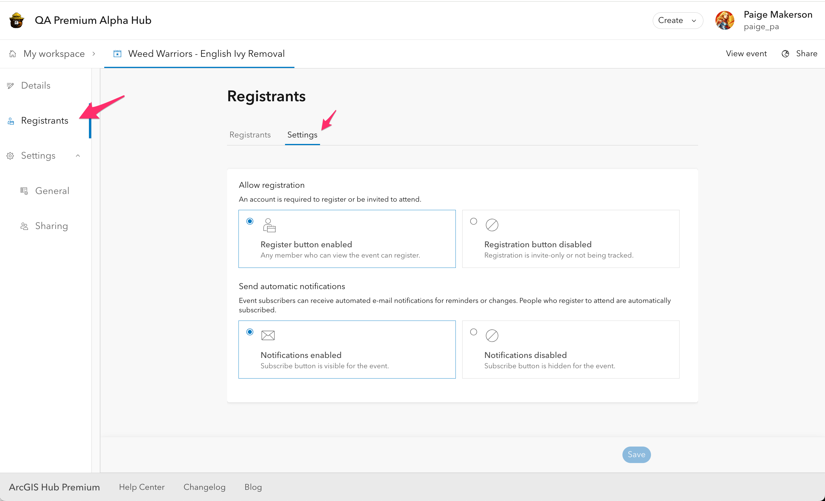- You can also disable automatic event notifications from Hub that go to anyone registered or subscribed to an event through the Registrants pane, if you prefer to send your own notifications from another system. Keep them enabled to ensure registrants stay updated on changes in event time, location, or status (such as cancellations).