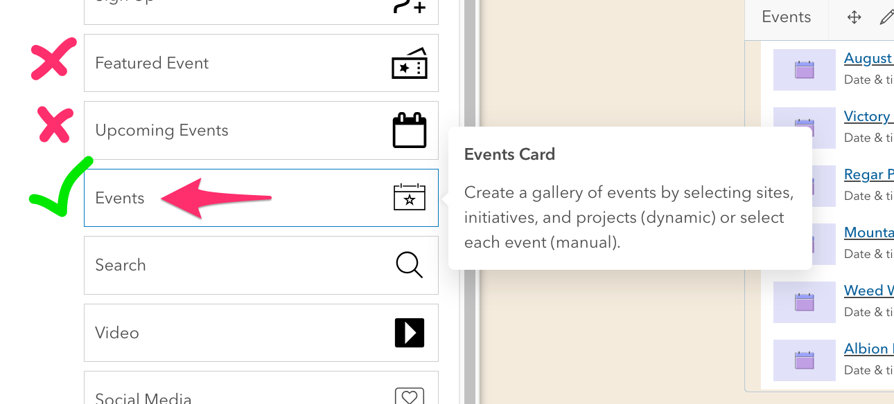 Note: Existing event cards (like Featured Event and Upcoming Events) will not display enhanced events. Use the new Events card.