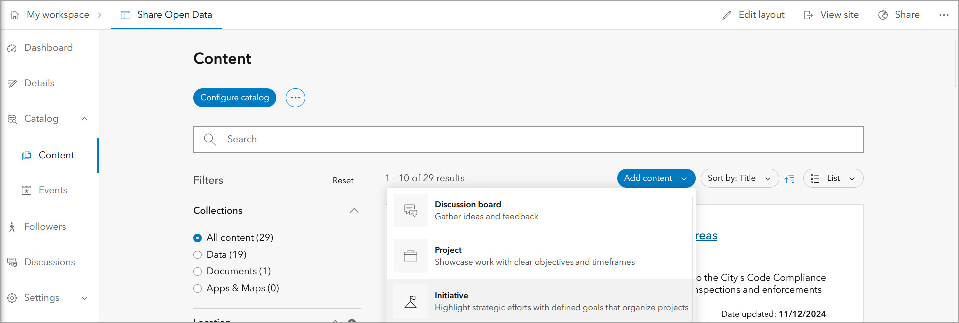 3. Use the Add content button to create an initiative and add it directly to the site’s configured catalog.