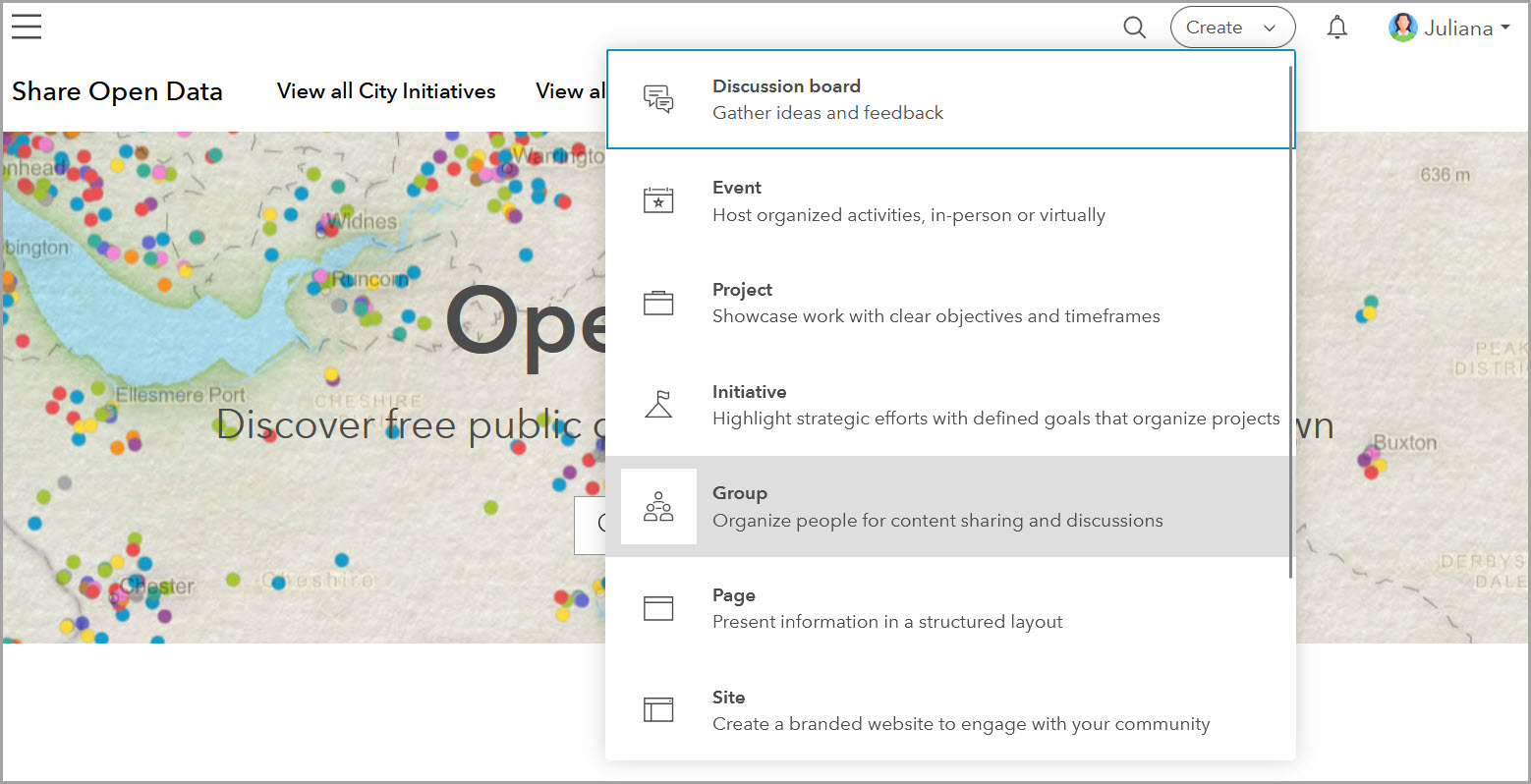With Hub Premium, you can create geo-enabled websites that integrate web maps, apps, datasets, and more. Use groups to create collaboration spaces that connect internal and external audiences. Work together on content, initiatives, and projects and engage through discussions and events.