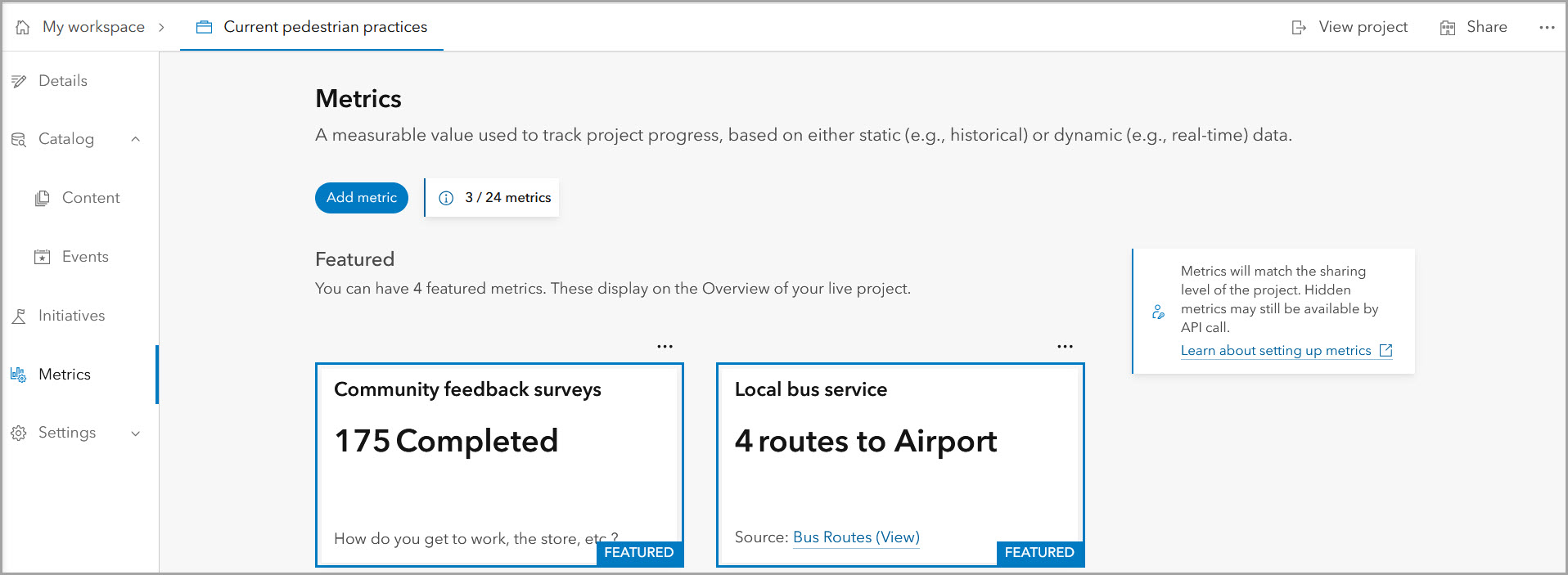 To demonstrate progress or show other measurable aspects of your work, you can add metrics to initiatives and projects. Just open the respective workspace and go to the Metrics pane. Metric values can be powered by a dataset to dynamically display.