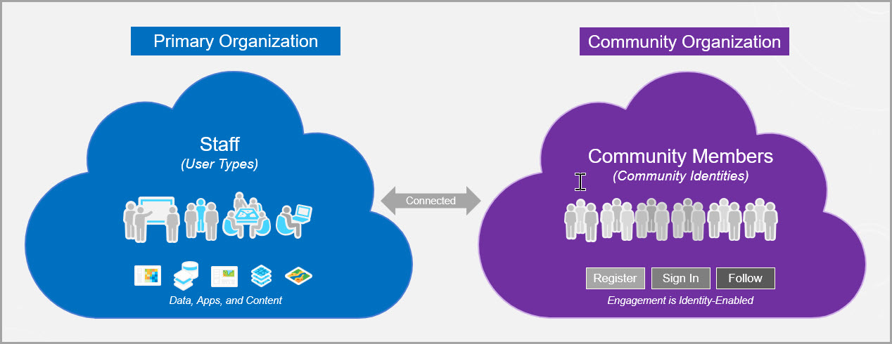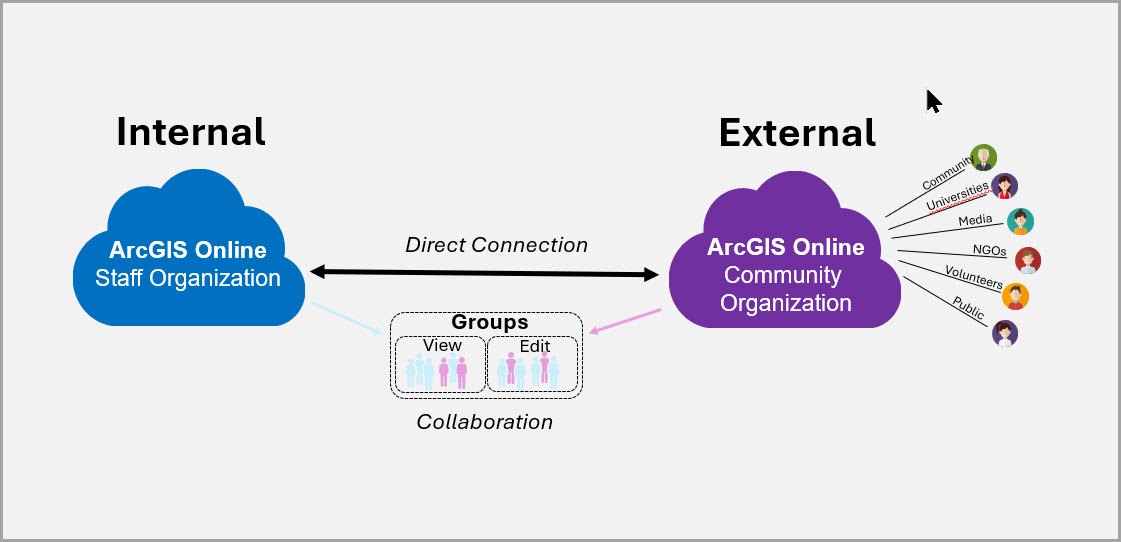Hub connects the two organizations and the sharing model in ArcGIS Online allows community members to view and create content through groups that you set up.