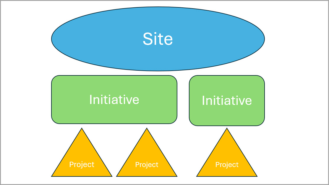 Hub Premium provides the capability to create and manage a site and create one or more initiatives (or projects) connected to the site. Projects can be nested under a related initiative through associations.