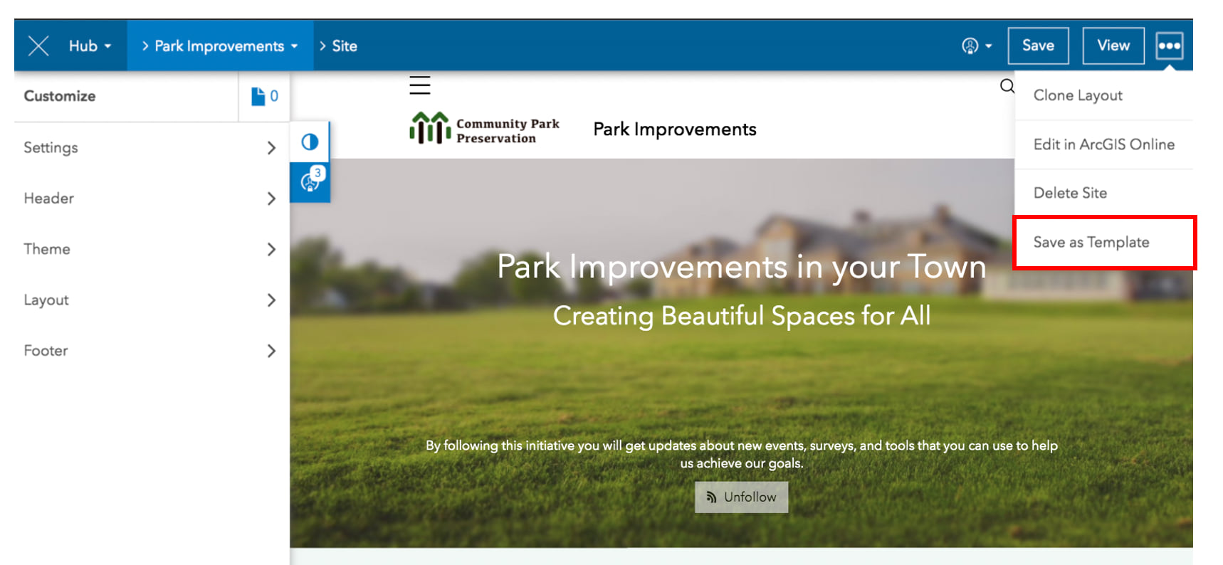 To get started, sign in to ArcGIS Hub and open an initiative in edit mode. Then, click the more button at the top-right corner of your screen and click Save as Template.