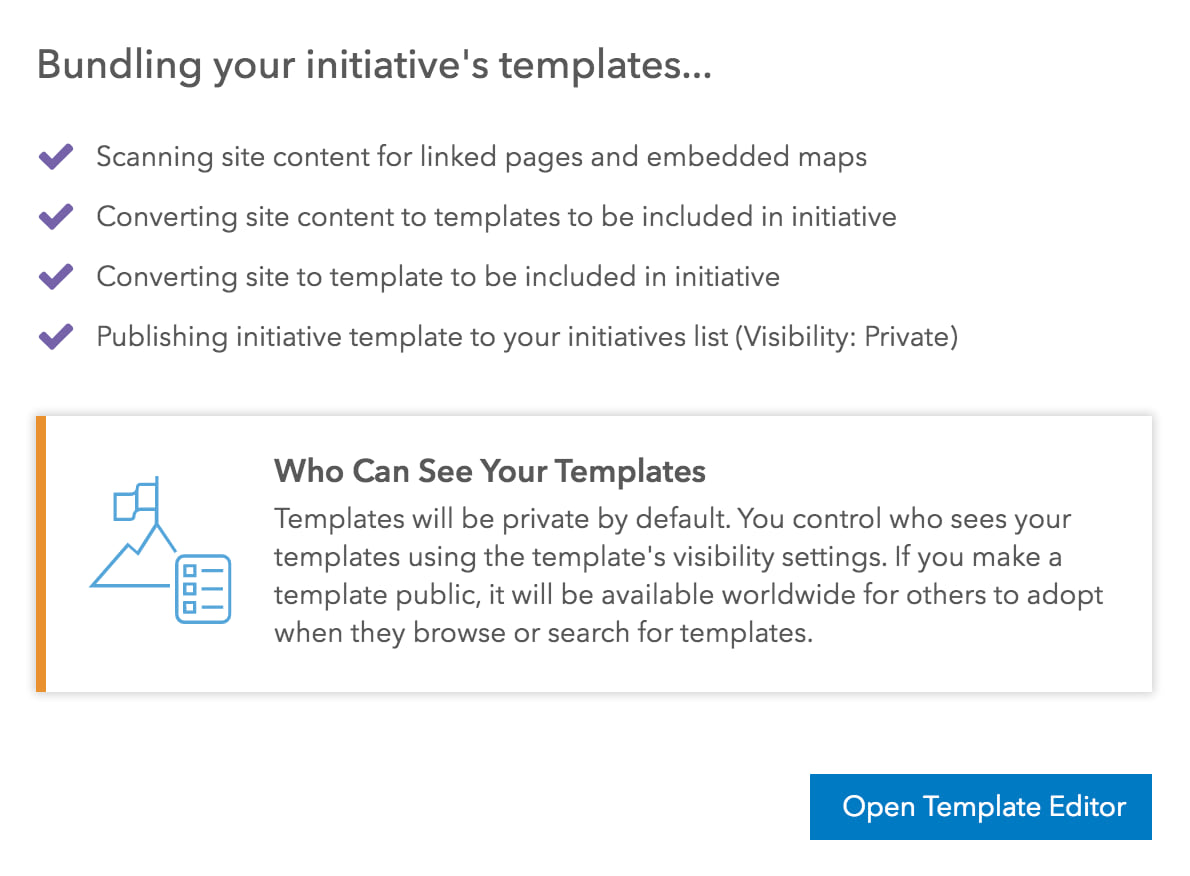 After creating the template, you can update the descriptive text in the template editor and share the template with the audience of your choice. For example, you can share the template with your organization so that anyone who has an account with your organization’s subscription to ArcGIS Online can adopt the template. You can also share your template with specific groups, including supporting teams and even members of another initiative’s core team.
