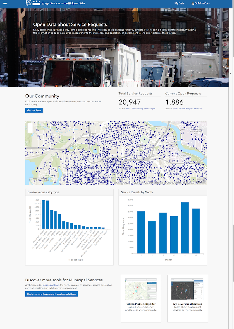 All organizations can start with the open data initiative today. ArcGIS Hub walks you through launching your first open data site and recommends meaningful open datasets to share that align with commonly used open standard data models. Once you adopt the open data initiative and link your data to requested indicators, you are contributing to a global catalog of standardized open data. Each indicator page includes maps and charts linked to your live open data that help the public quickly understand the current status of service requests, addresses, financial budgets and spending.