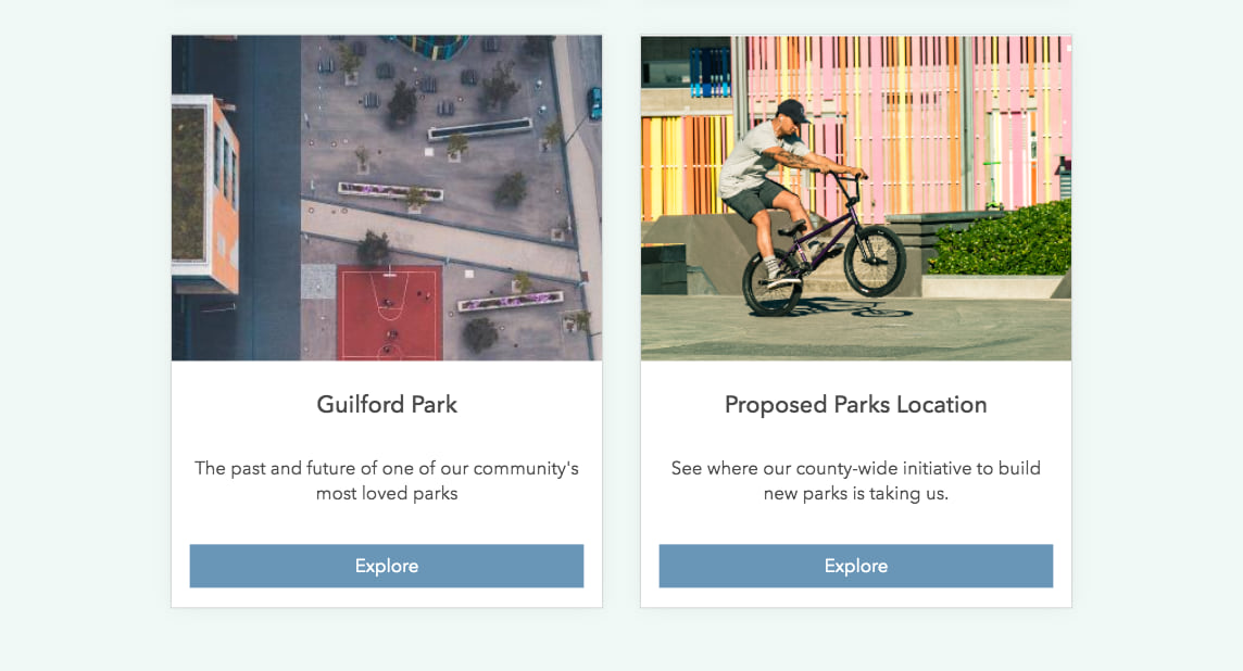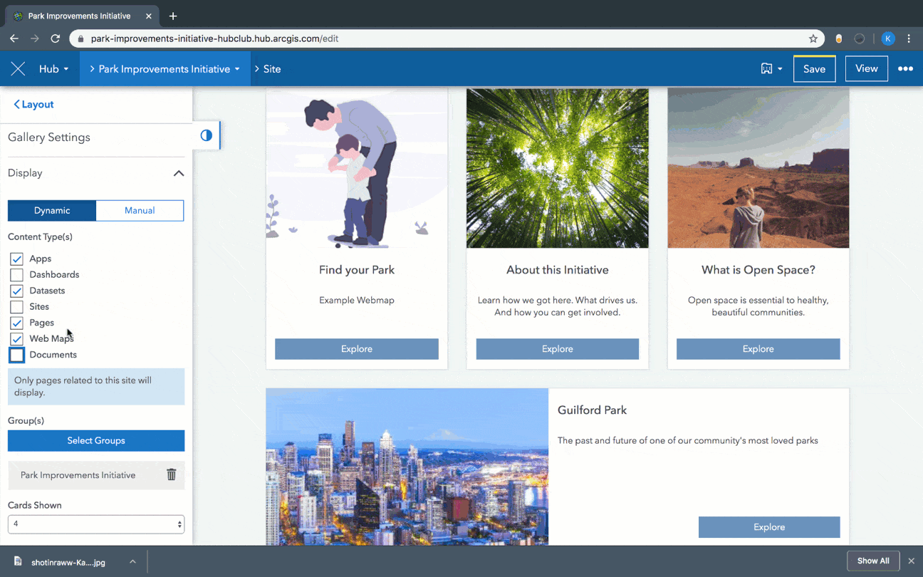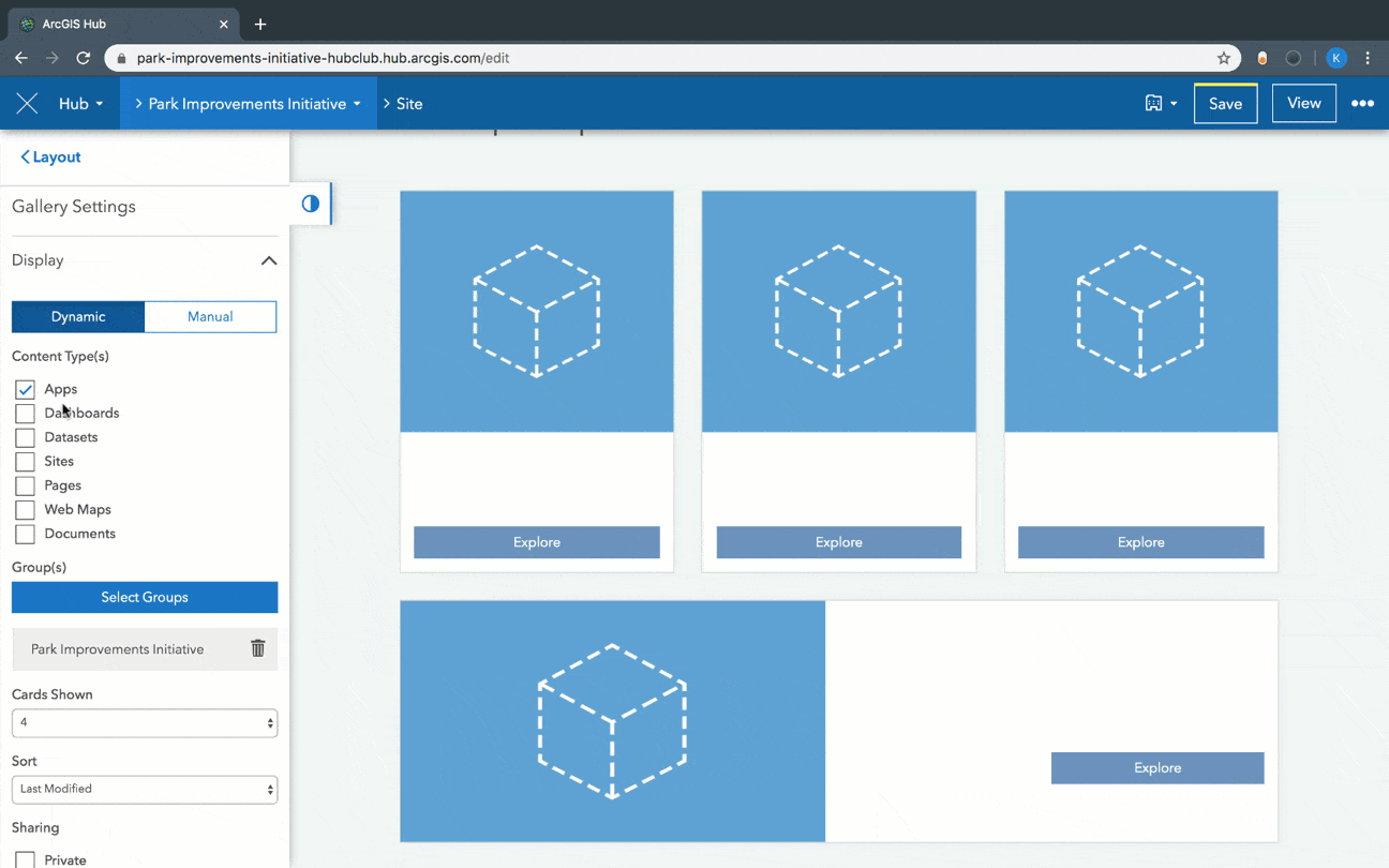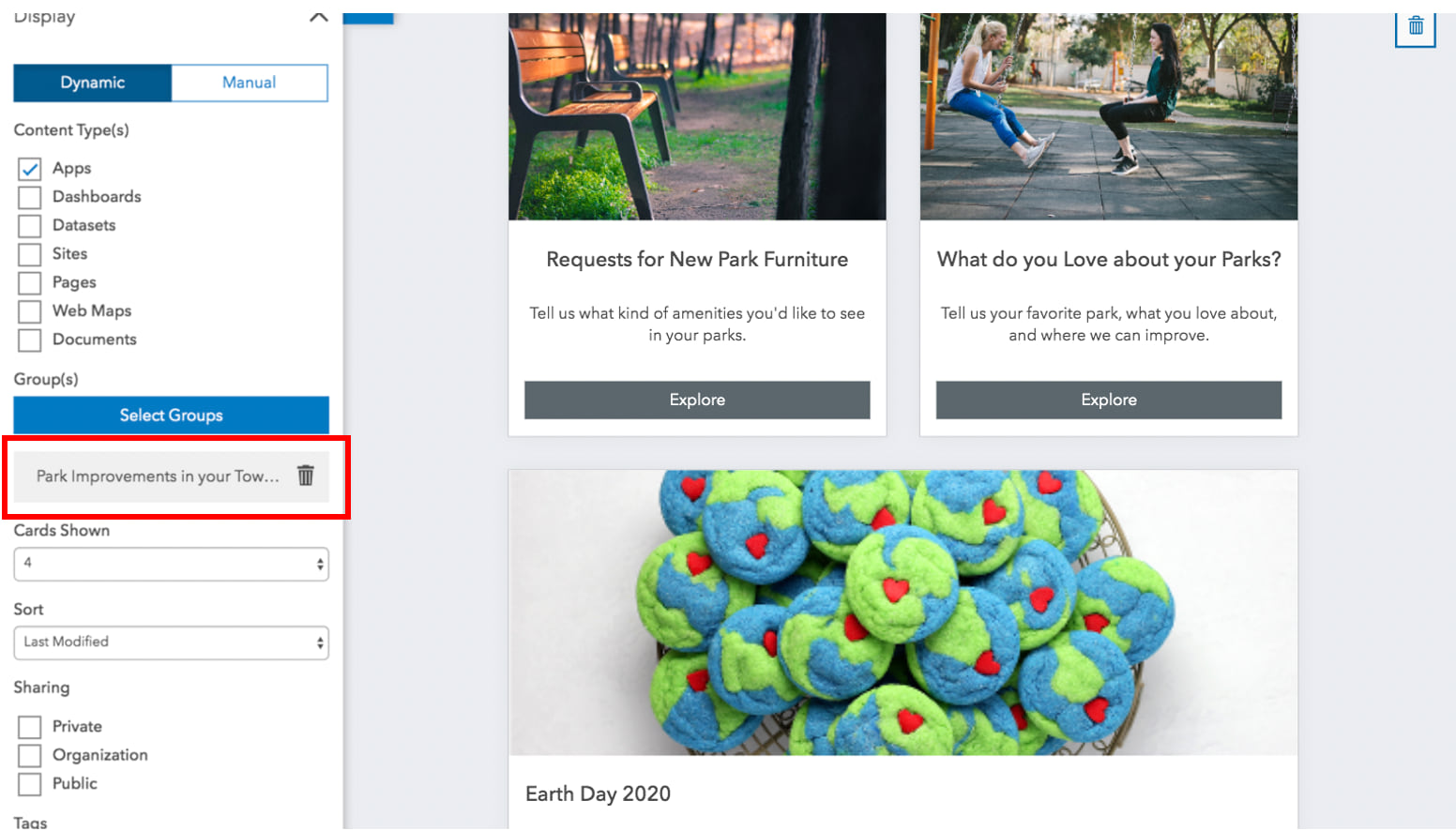 One of the most popular tools used to display content on a site is the Gallery card. This card can display a mix of items, including dashboards, apps, web maps, and even other sites and pages using the item’s thumbnail and summary.