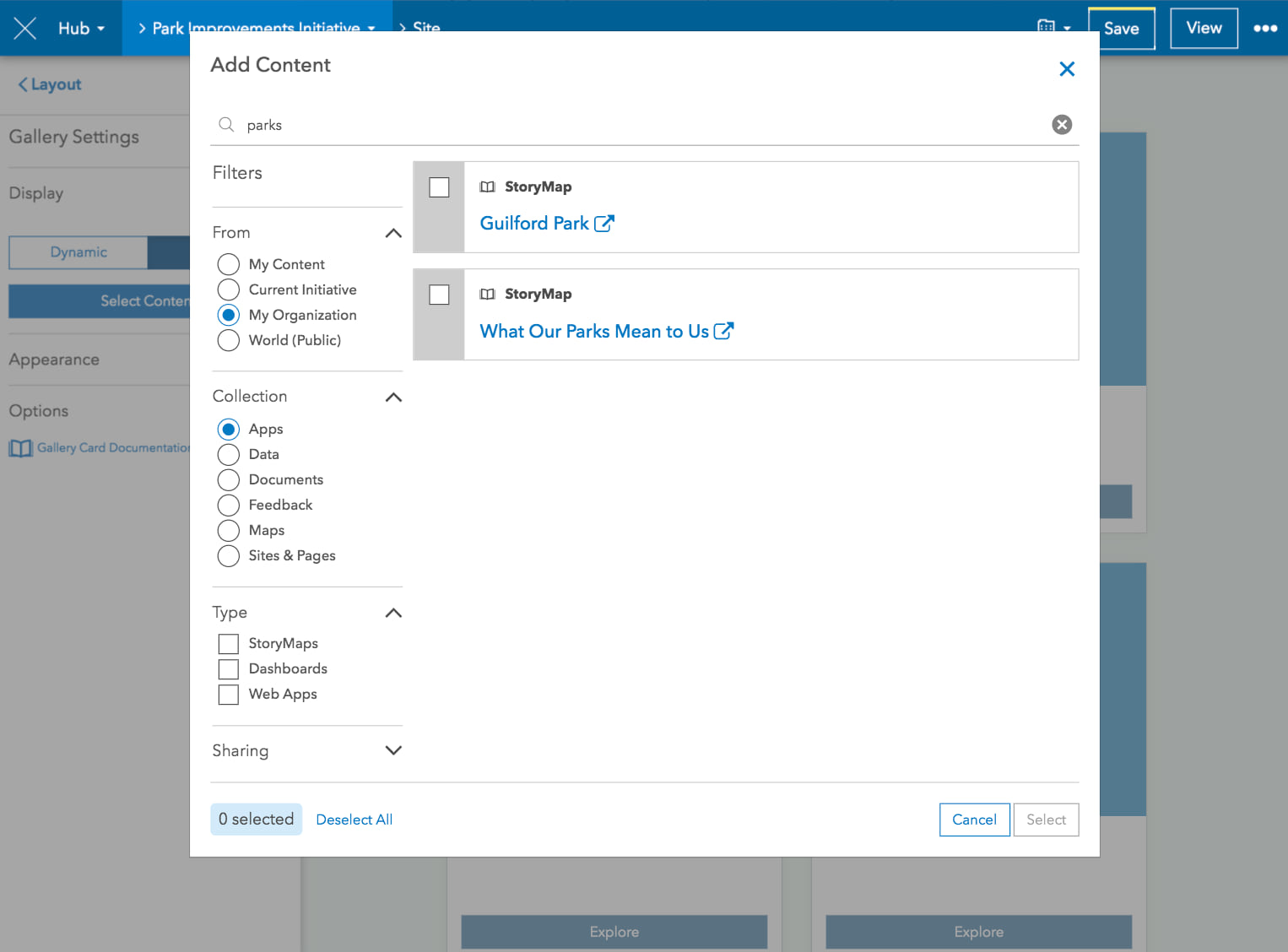 To populate a gallery with private content, simply select Private and/or Organization. Private refers to an item that’s private or privately shared to any selected group. Organization refers to items shared with all members who have access to your organization’s subscription to ArcGIS Online.