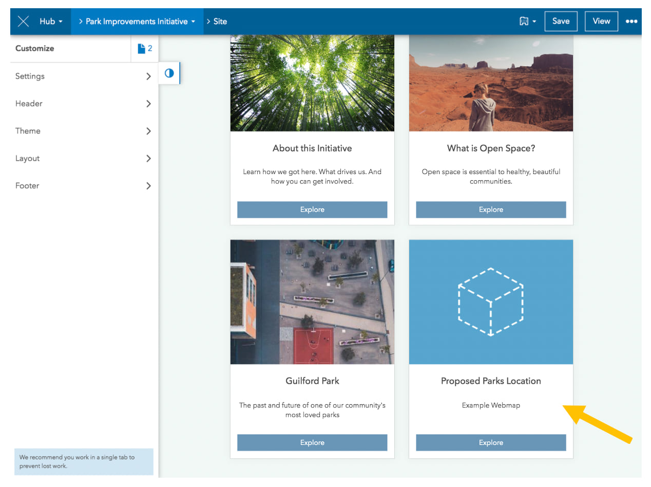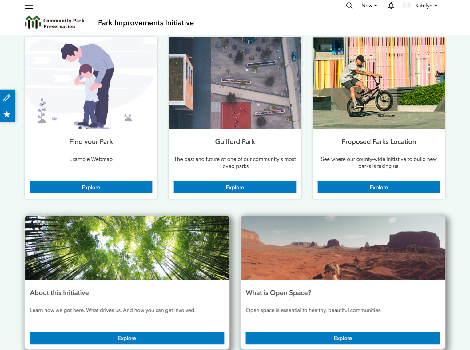 If you’re interested in creating a gallery, but don’t have a site yet, get started with ArcGIS Basic by signing in with your ArcGIS Online account. Or, if you have ArcGIS Hub Premium, you can get started by launching a new initiative.