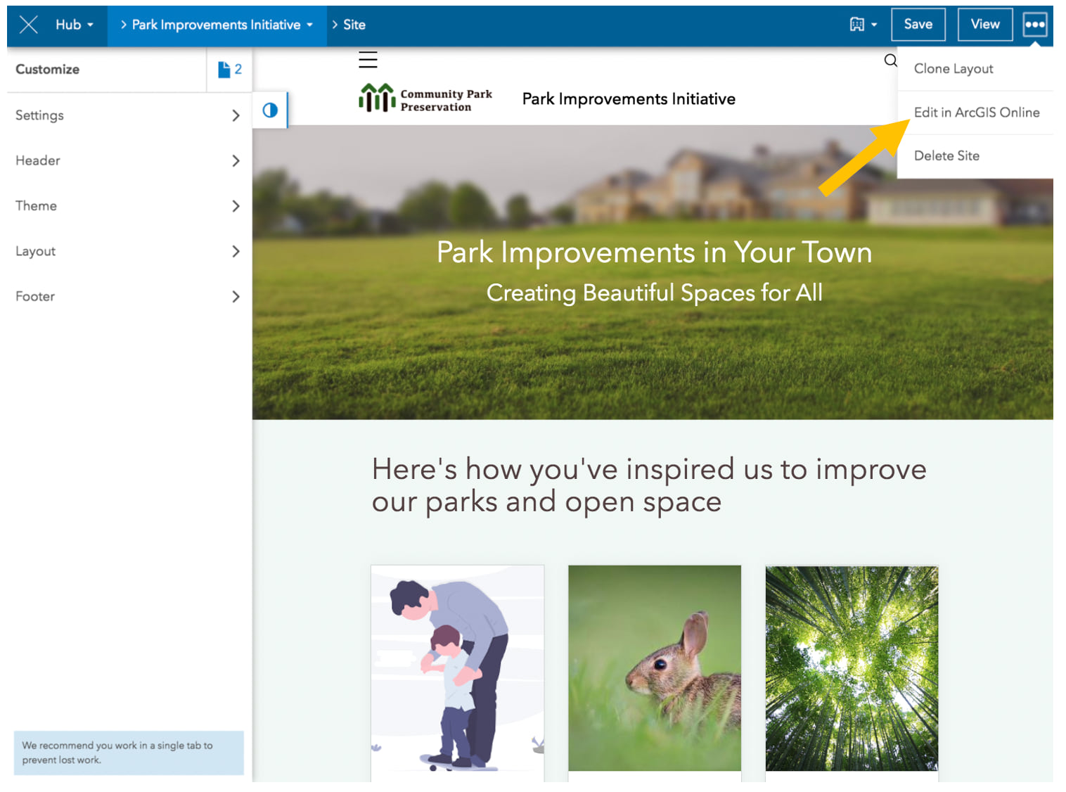 After clicking on Edit in ArcGIS Online, we’ll land on the site’s (or initiative’s) item details page.