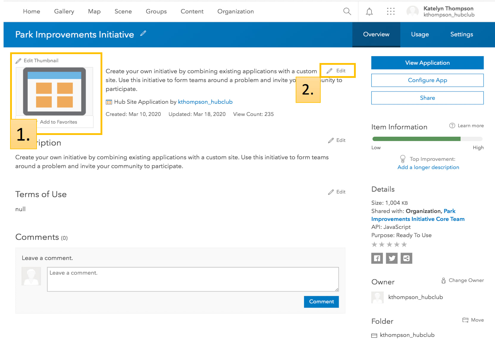 After accessing the Proposed Parks Locations item’s details page, we can edit the thumbnail and summary.