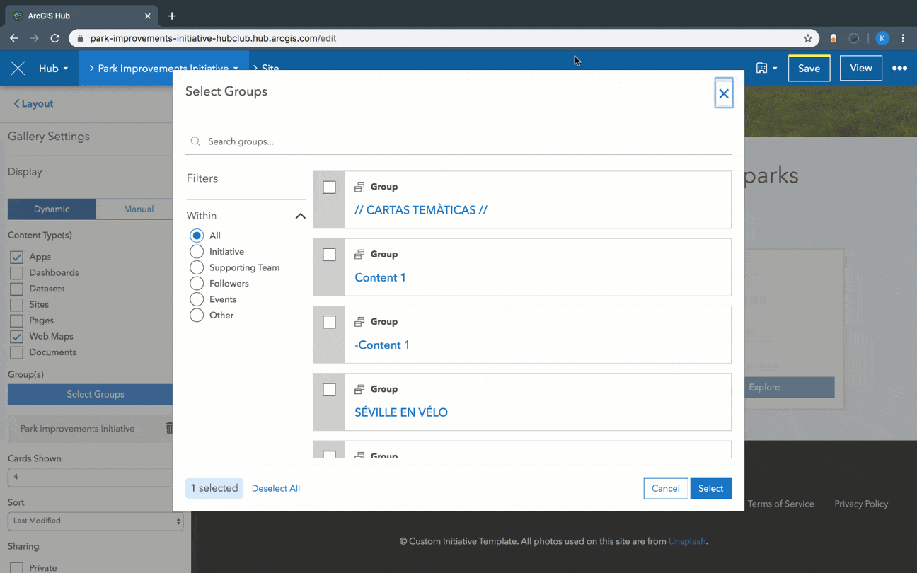 You can also use your own groups, public groups, and any group shared with your organization, to populate a gallery. This includes the core team group (included with ArcGIS Hub Basic and ArcGIS Hub Premium) and the followers group (ArcGIS Hub Premium only), so that you can create galleries for specific audiences.