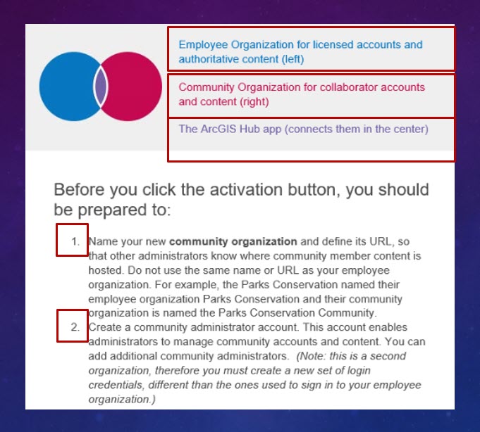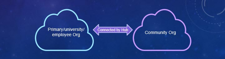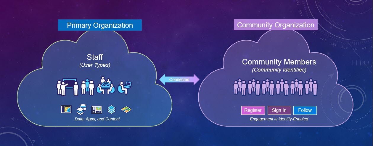 Before activating the community organization (Hub Premium only), you need a basic grasp of how it interacts with the primary (employee) organization. A community organization is a configured ArcGIS Online subscription, in addition to your current primary ArcGIS Online organization (employee organization).