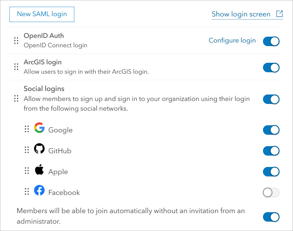 New community members can use their email address to sign up. You can also provide options for them to use their credentials for Facebook, Google, Apple, or GitHub. In addition, the sign in prompt can be configured to use a third-party provider for single sign-on. Learn how to configure security settings such as the sign in prompt in ArcGIS Online (Organization > Settings tab).