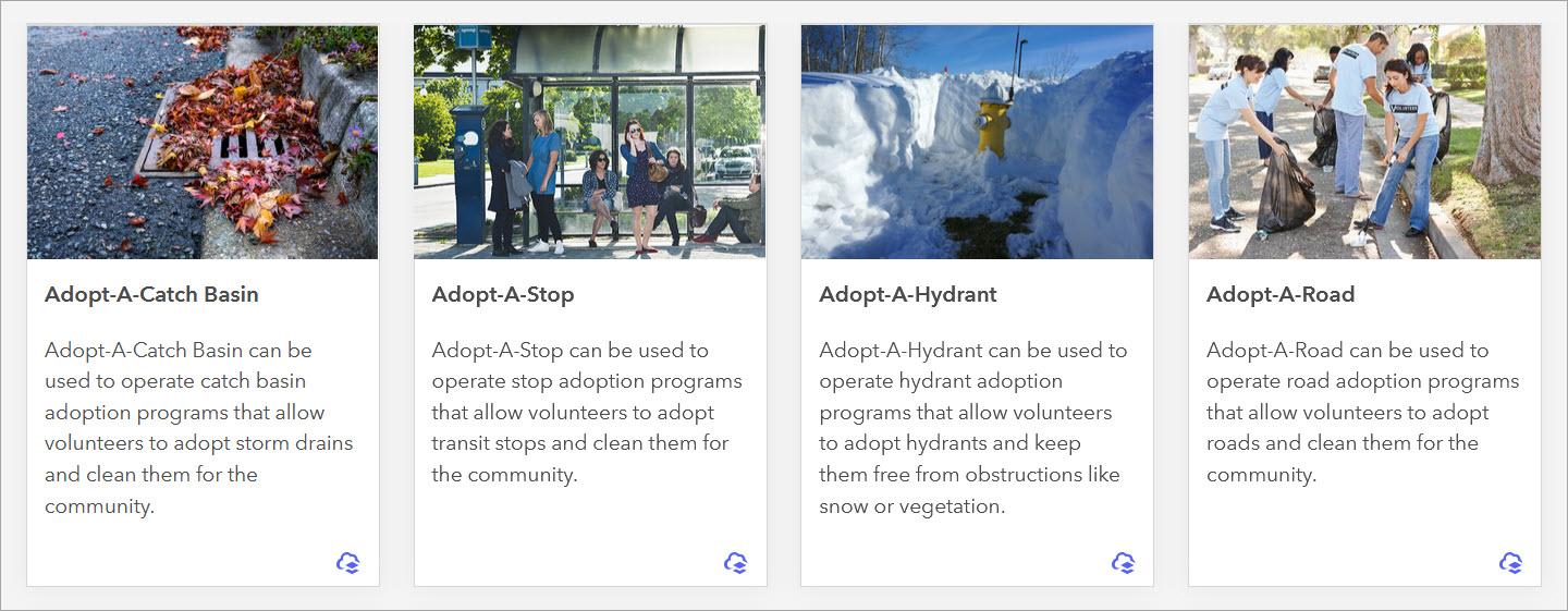 A wide assortment of ArcGIS Solutions make use of Hub community engagement tools that facilitate upkeep and care of public facilities such as Adopt-A-Road, Adopt-A-Tree, and more. You can activate a solution and customize it to suit the needs of you and your community.