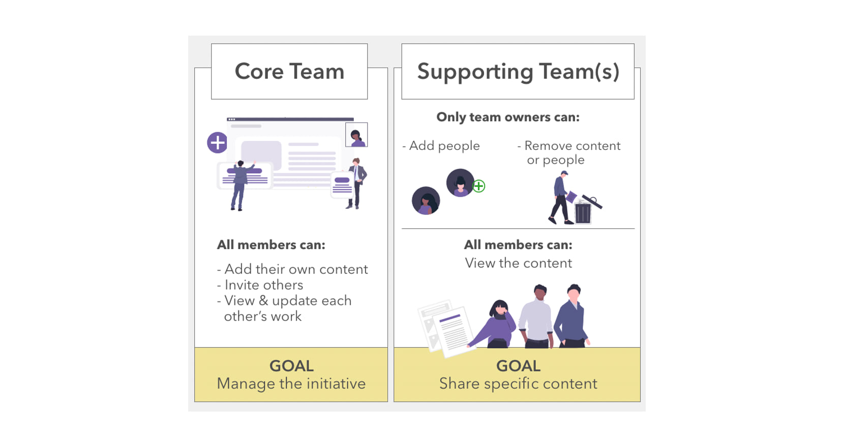 For example, you can create a supporting team to share a page and its content privately for feedback from specific stakeholders. Supporting team members can only view the content that has been shared with them; they cannot edit your site or initiative and its content.