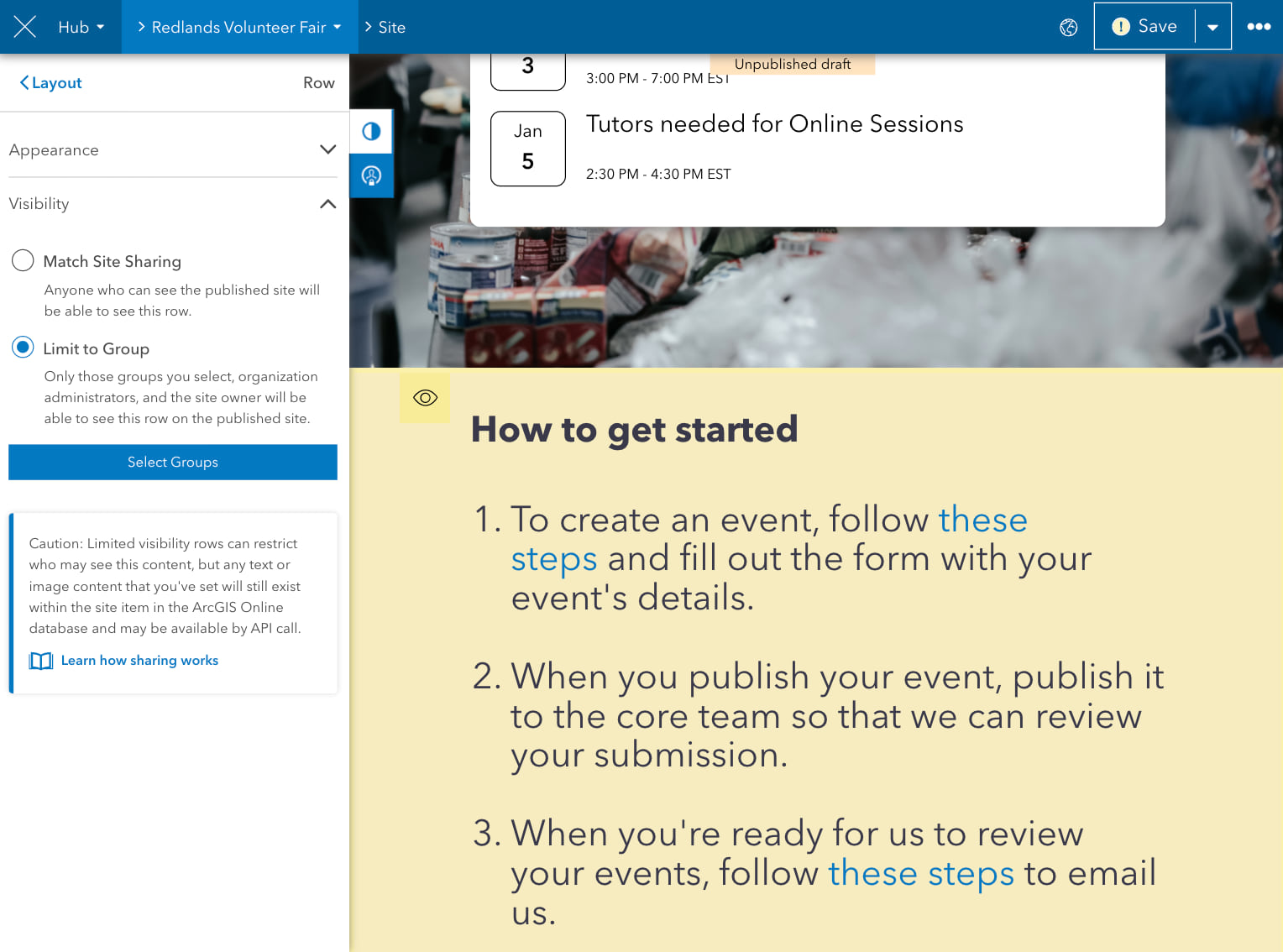 To confirm the row’s visibility setting, ensure that your site is shared with the public, then click Save and Publish Draft. In the top-right corner of the site, click your profile dropdown menu and choose Sign Out. The row disappears because you are viewing the site anonymously. If needed, revert the site’s visibility back to the core team or organization.