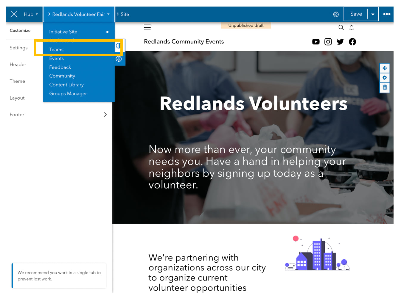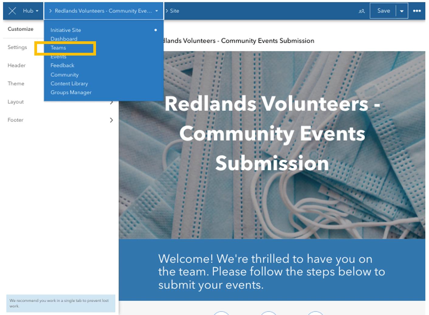 All new initiatives are shared privately with members of the initiative’s core team group, so you can always manage the initiative internally. To add your partners to the group, open the initiative in edit mode and click the second drop-down menu in the navigation bar. Choose Teams.