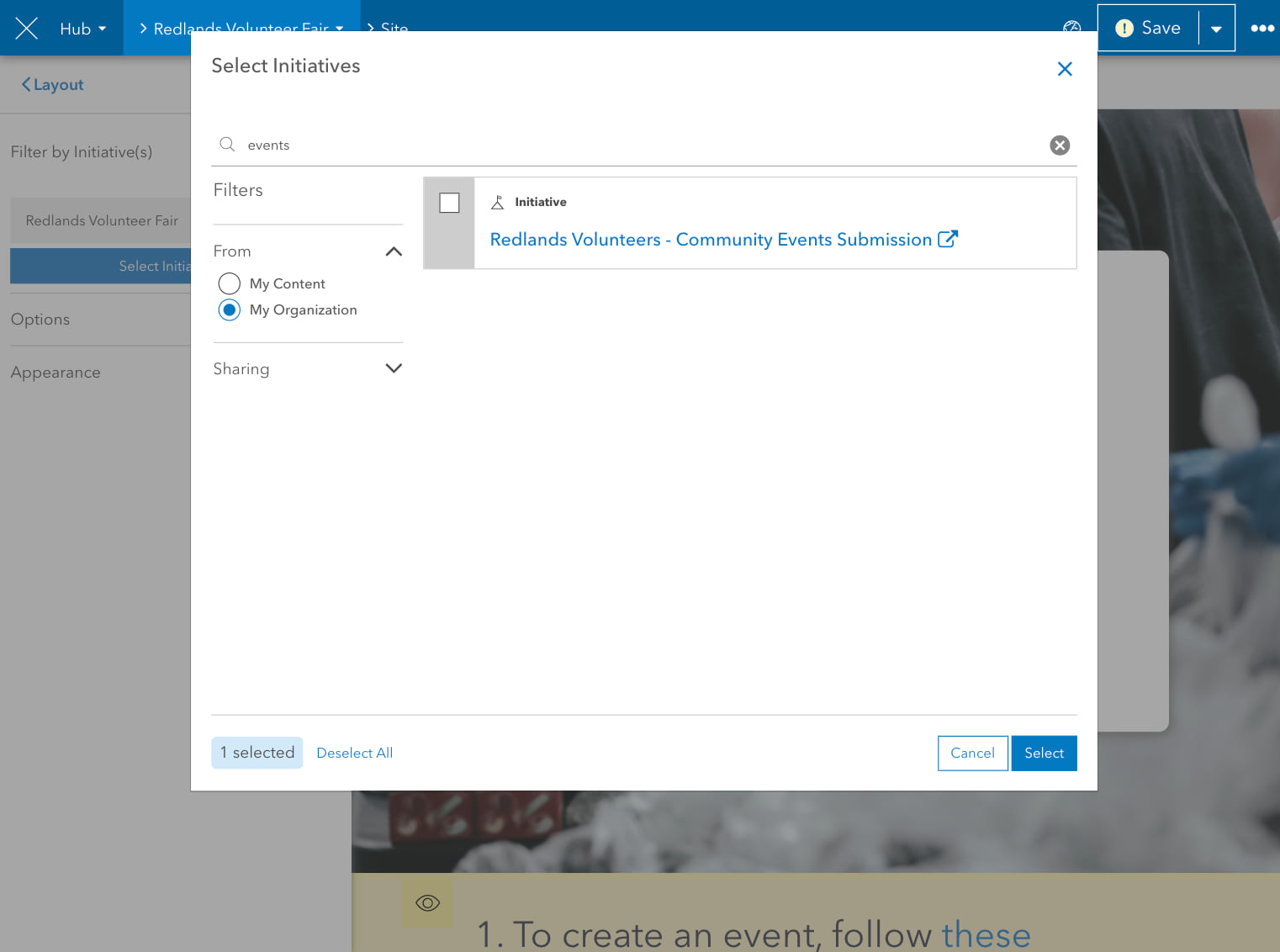 Open the official initiative in edit mode and add an Upcoming Events card to the layout. On the side panel, click Select Initiatives.
