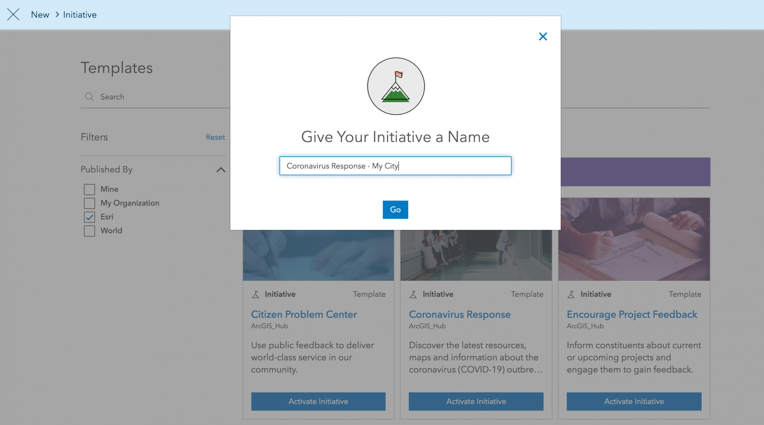 Next, you’ll be prompted to provide a name for the new initiative. This name will be used to configure your site’s URL.