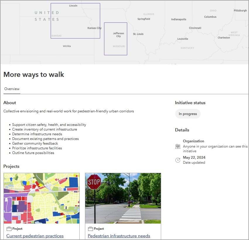 You can connect related projects, leverage maps and data, build in performance metrics, and include relevant content. The standardized view of redefined initiatives ensures that stakeholders have a consistent experience across your various initiatives.