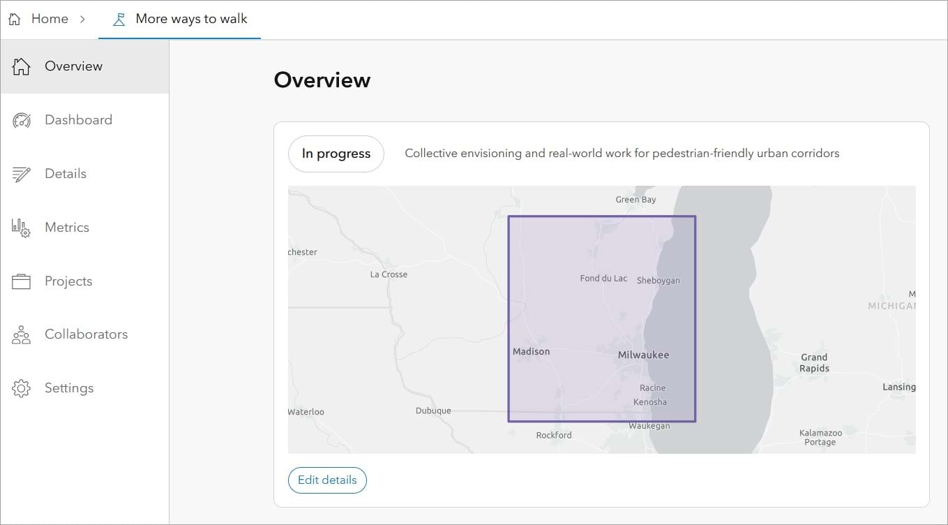 Add and edit the title, summary, status, a map or image, metrics, and more via the workspace panes. Don’t forget to save your changes!