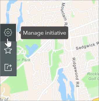 - Settings pane- Here you can do something new! Choose an existing web map or scene to show on the initiative view (see Custom web maps and web scenes below). Initiative owners can turn on delete protection or delete the initiative.