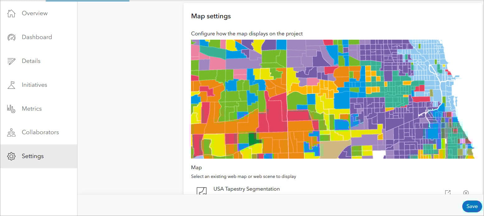 From the published view of a project, initiative, or discussion board, select the Manage button to access the workspace. On the Settings pane, you can select an existing web map or web scene to display.
