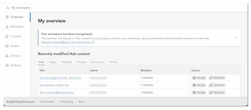 We are excited to announce the release of workspaces, the new management experience in ArcGIS Hub. Workspaces modernize and streamline the Hub management interface, offer more configuration options, and add new functionality to ArcGIS Hub Premium. Hub site owners, data managers, and other editors: join this short excursion into the basics of workspaces.