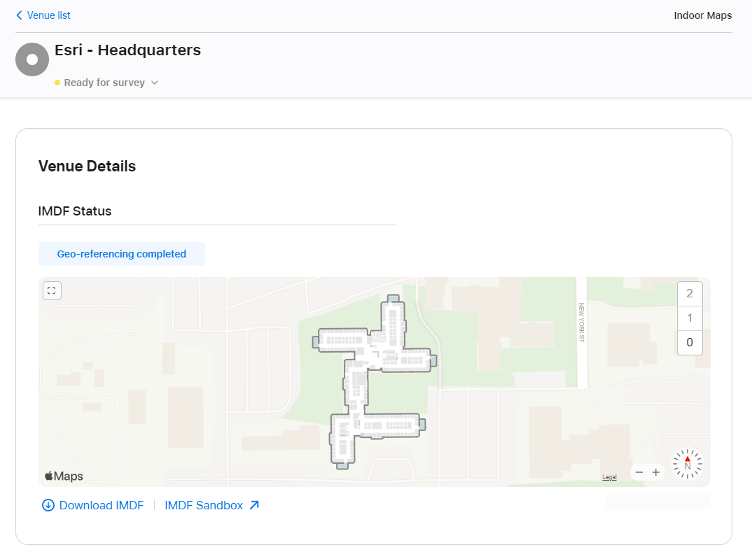 Once you have registered with Apple Indoor Maps, you must create a venue associated to the address of your building and submit it for approval. After Apple approves the venue, you can upload the IMDF for further validation.