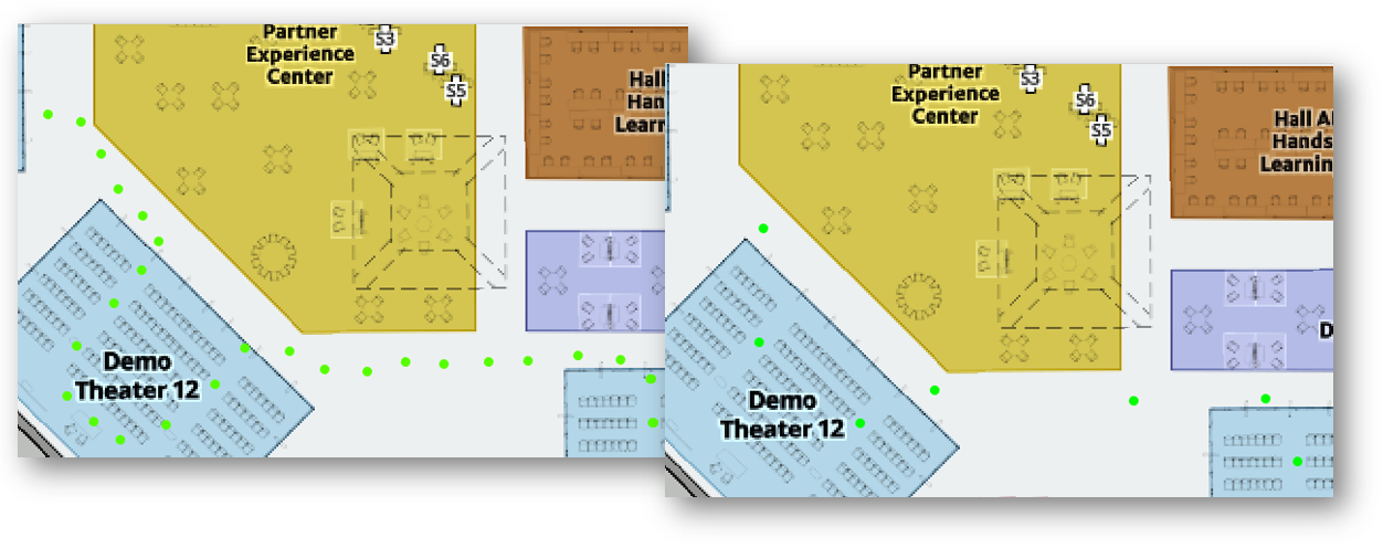 - Do a looping route. Revisit the starting area before stopping the recording. This helps VSLAM “close the loop,” reducing positional drift over time. For large spaces such as auditoriums or convention centers, plan a looping or S-shaped path that achieves regular visual overlap.