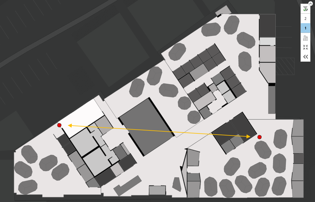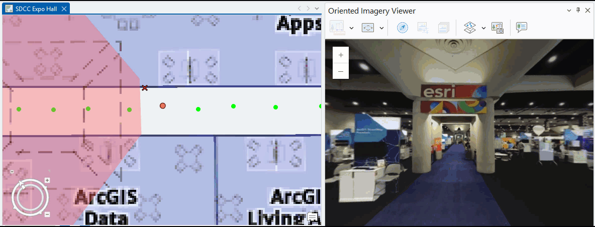 By default, output features will appear with an arbitrary scale and rotation near coordinate origin (0,0), sometimes called Null Island. To properly align the oriented imagery features with your facility floor plans, specify two control points located on opposite ends of the captured space.
