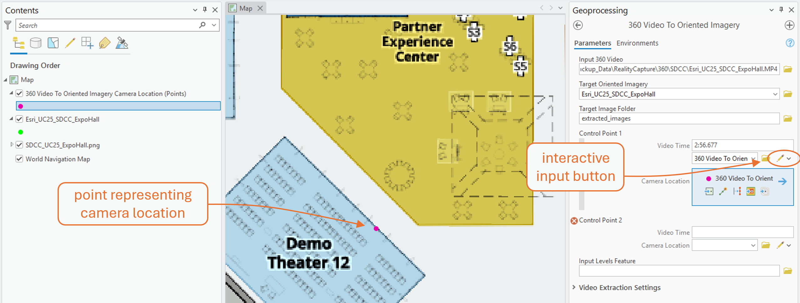 The 360 Video To Oriented Imagery geoprocessing tool extracts individual frames from the video, computes the camera’s location and orientation for each frame using VSLAM, and creates features in the oriented imagery layer.