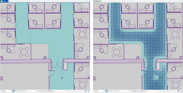 The tool calculates the possible walkable paths between two consecutive position estimates based on the input data and generates a feature layer that can be used to visually inspect the connected traversable paths for each valid level.