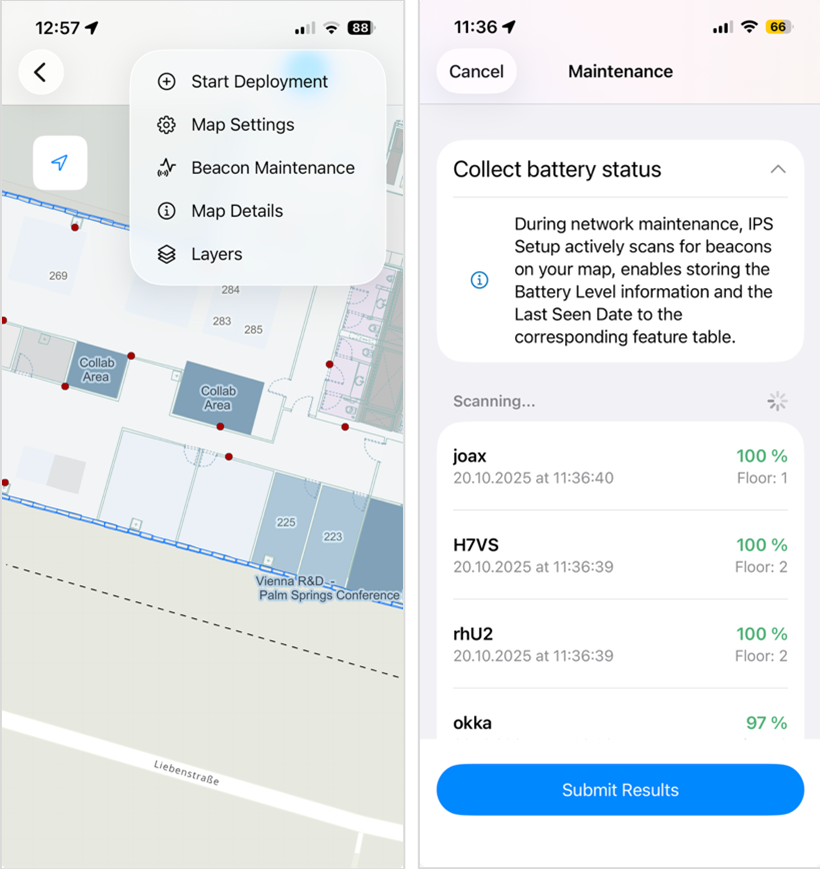 The IPS Setup 1.8 release, scheduled for December 2025, introduces a new, streamlined workflow for beacon network maintenance. IPS deployment administrators or facility technicians can now perform a simple walk-through of their spaces while running the new Maintenance Scan. During the scan, the app automatically detects nearby beacons, retrieves their battery levels, and saves the information to the IPS_Beacons feature table.