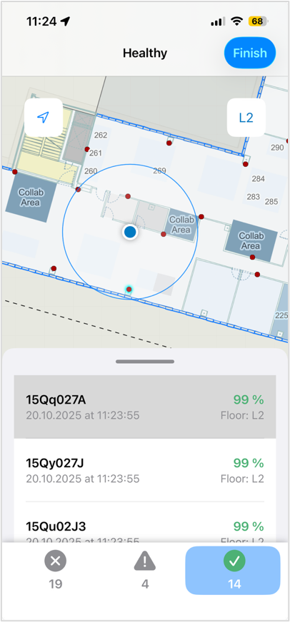 Within the app interface, users receive real-time insight into each beacon’s condition. Beacons with low battery levels are clearly highlighted and flagged for maintenance directly on the device. All relevant information is also recorded in the feature table, ensuring accurate tracking and facilitating proactive upkeep of the beacon network.
