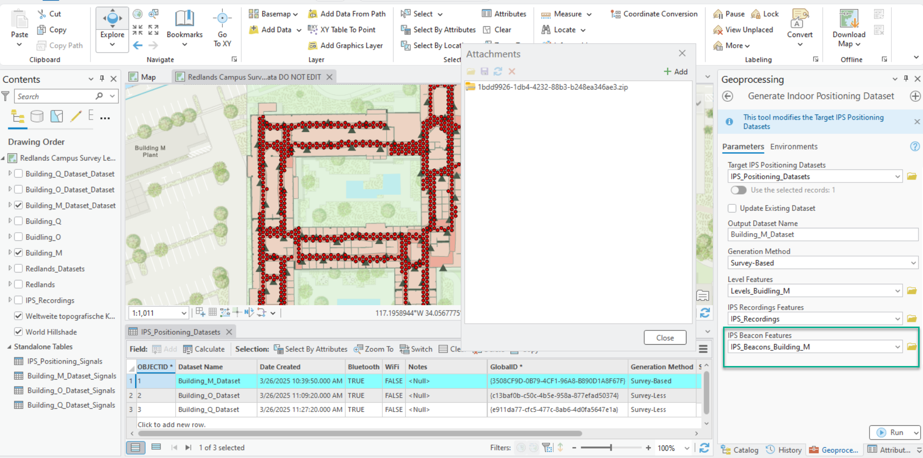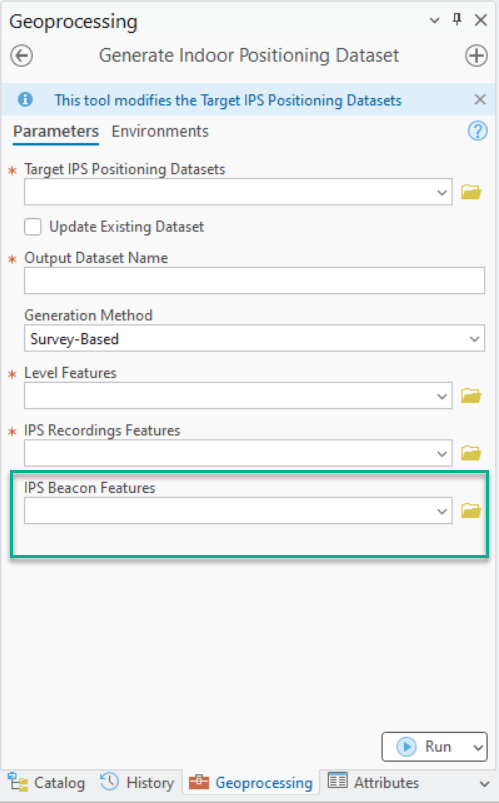 If beacon features are provided in a survey-based method, the generated IPS positioning dataset in IPS_Positioning_Datasets feature class includes the attachment with the necessary beacon information to support adaptive radio positioning. Since IPS Beacon Features is a required parameter in a survey-less method, the attachment is always generated.