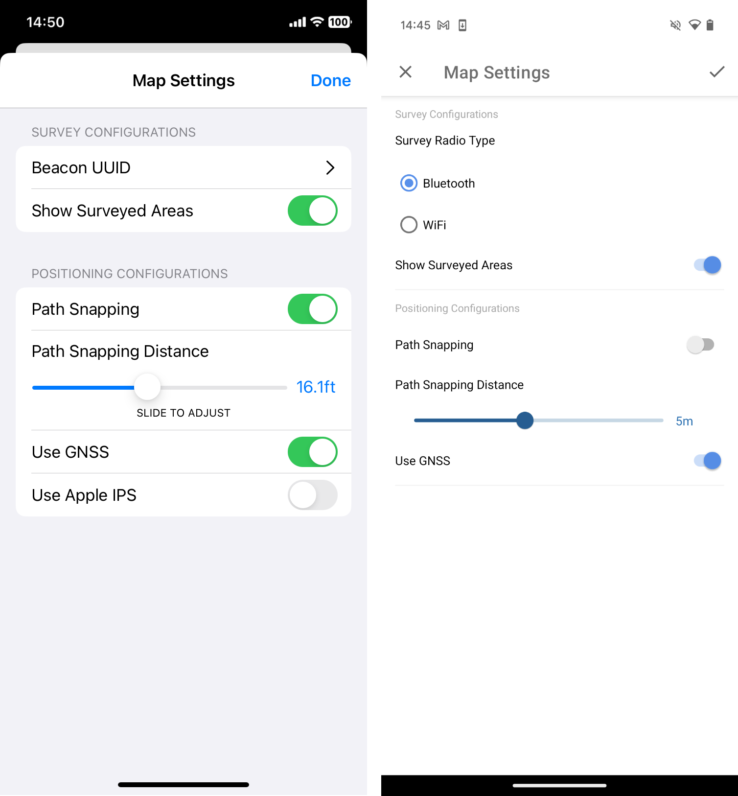 A challenge with the radio signal strength matching principle is that indoor positioning accuracy can vary depending on the hardware used. Devices with lower-quality sensors often struggle to detect weaker signals, such as those emitted from BLE beacons that are farther away from the device’s current location. Devices with highly sensitive built-in sensors are more capable of detecting both strong and weak radio signals equally well. Sensor performance on iPhone devices is consistently high across models, whereas Android devices, due to their wide variety, may include models with lower-quality sensors. The survey-based positioning data generated using phones with highly sensitive sensors may include weaker signals that some Android phones may interpret incorrectly. This can lead to reduced positioning accuracy on lower-end Android devices.