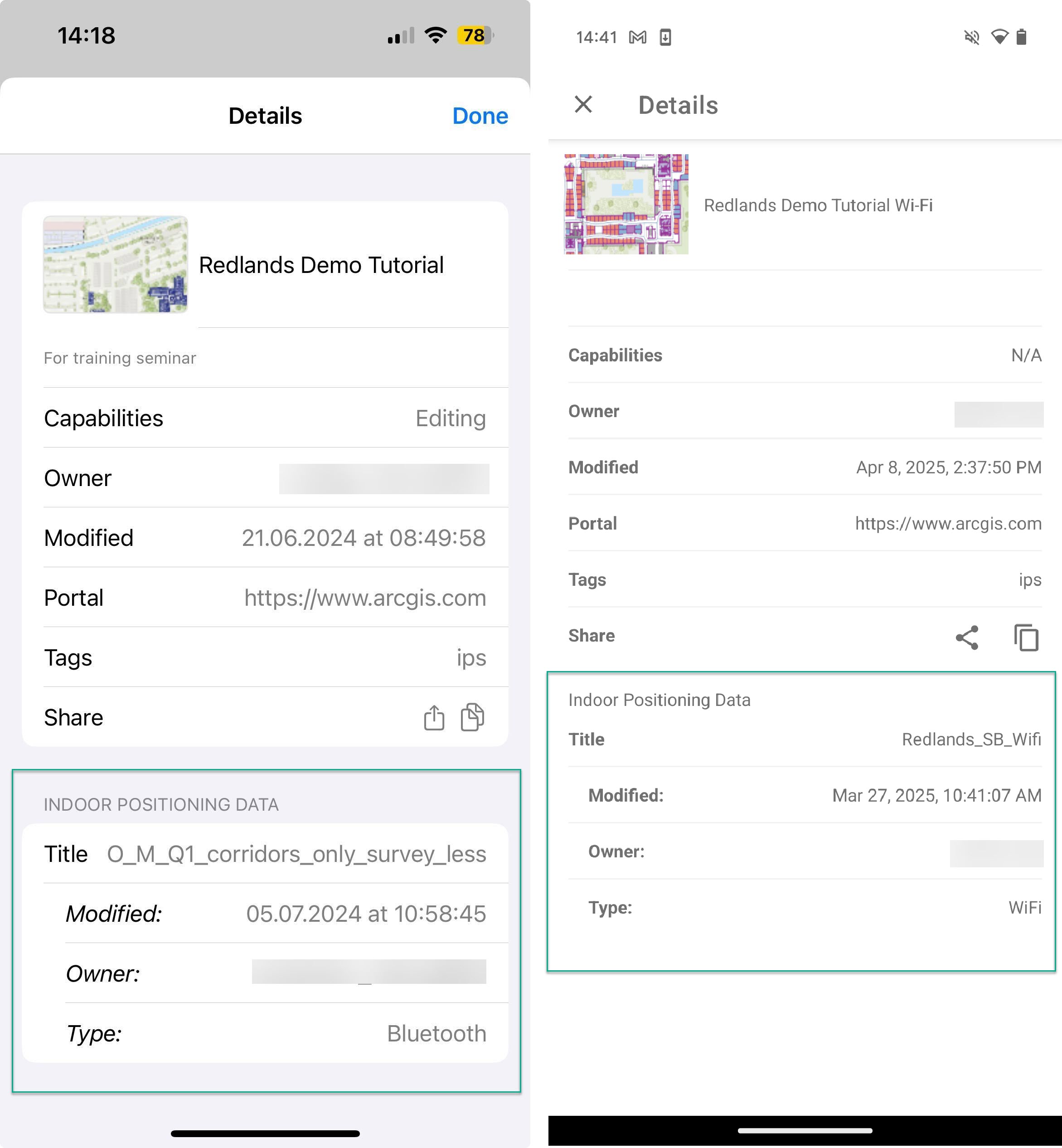 The last enhancement ArcGIS IPS Setup brings in the 1.7 release is additional information about the positioning data powering a specific IPS-aware map. This information is presented in the Indoor Positioning Data section of map details accessible from the app’s map list.