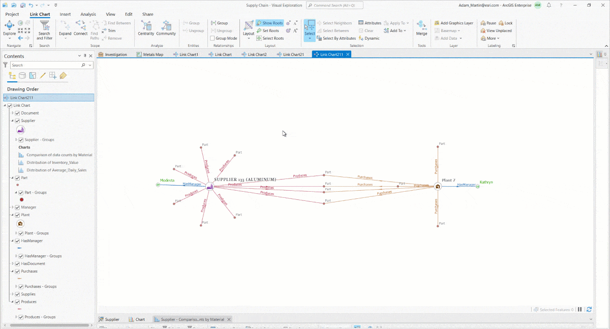 ArcGIS Knowledge in ArcGIS Pro provides multiple ways to investigate connected data using point-and-click maps, link charts, charts, histograms, and free text search.