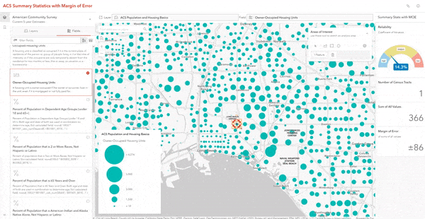 This lightweight app is designed to help you get a quick sense of how many tracts you’ll need to aggregate together to get an estimate that meets your desired reliability. The left panel lets you search and select layers and attributes. If you select a count, the tract centroids will be symbolized by size. If you select a percent, the tract centroids will be symbolized by color.