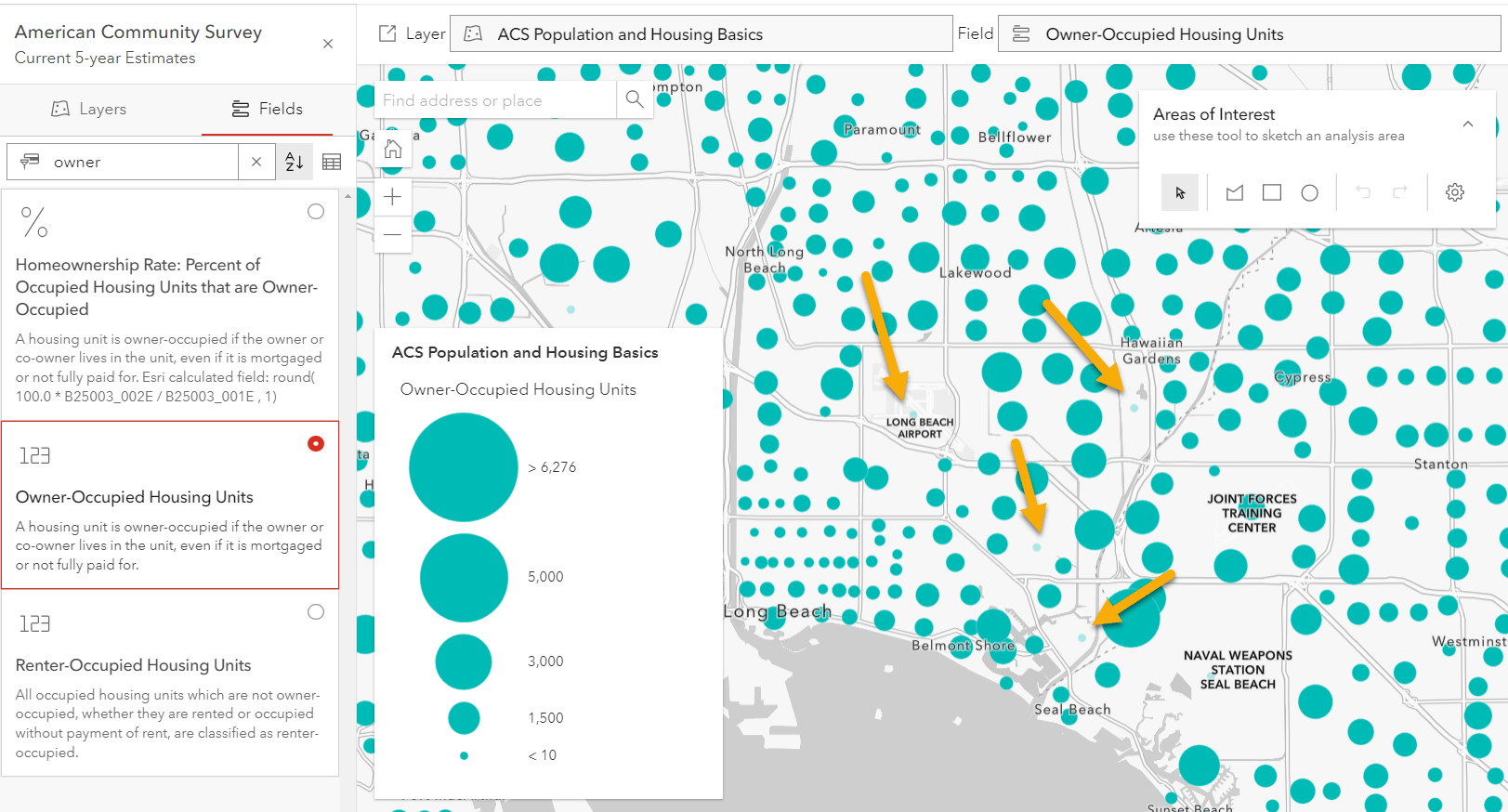 Tracts with an estimate of zero are symbolized by the transparent teal symbols (for counts). These are generally in places such as airports, cemeteries, open land, and so on, but they can be anywhere.